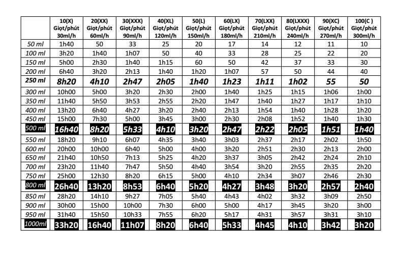 Việc tính toán thời gian truyền dịch theo giọt/phút giúp đảm bảo quy trình diễn ra hiệu quả và an toàn. Dưới đây là bảng tính thời gian dịch truyền dựa trên tốc độ truyền tính bằng giọt/phút.