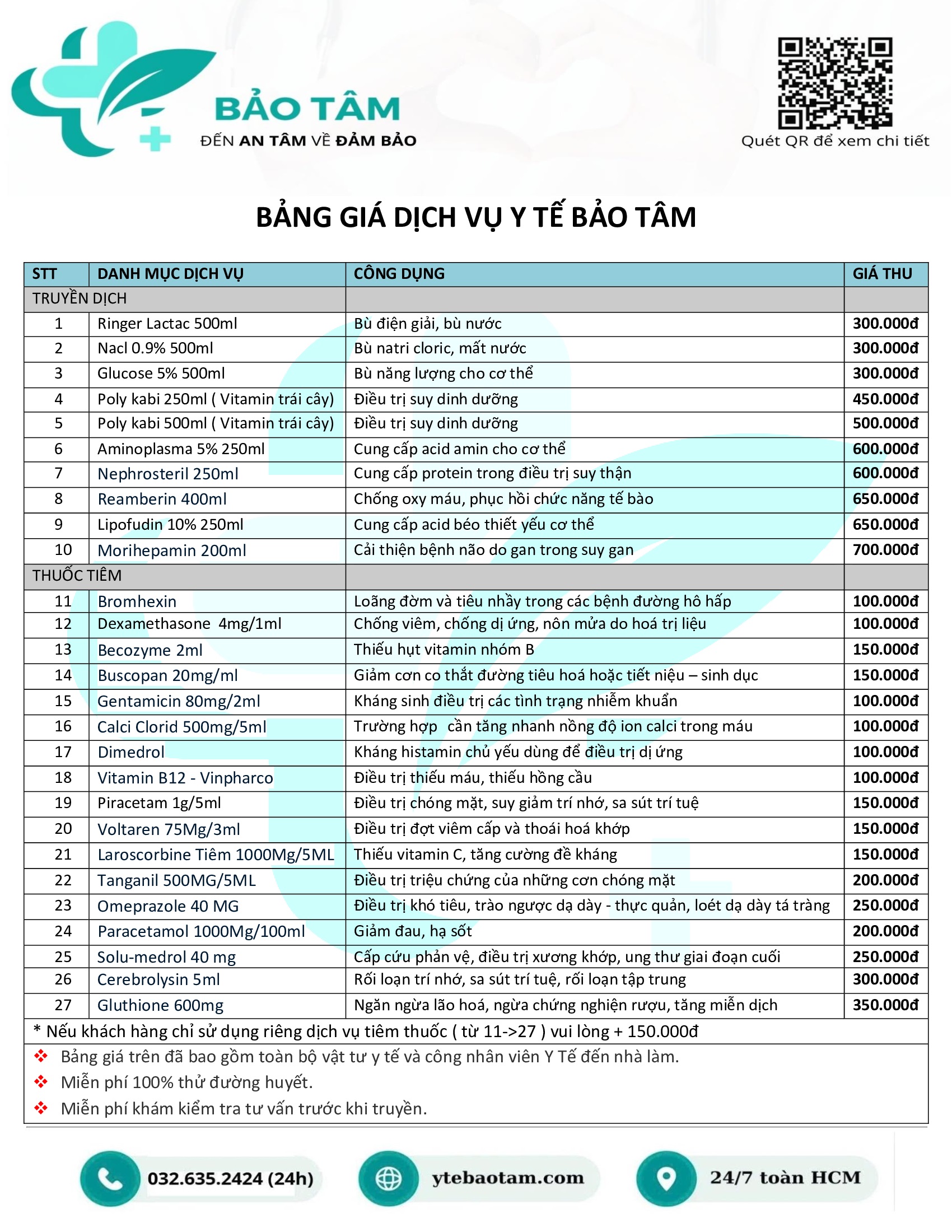 Nếu có nhu cầu truyền nước biển tại nhà an toàn, chuyên nghiệp, bạn hãy nhanh tay liên hệ với Y Tế Bảo Tâm. Chúng tôi tự hào cung cấp cho quý bệnh nhân dịch vụ y khoa chất lượng cao như sau: